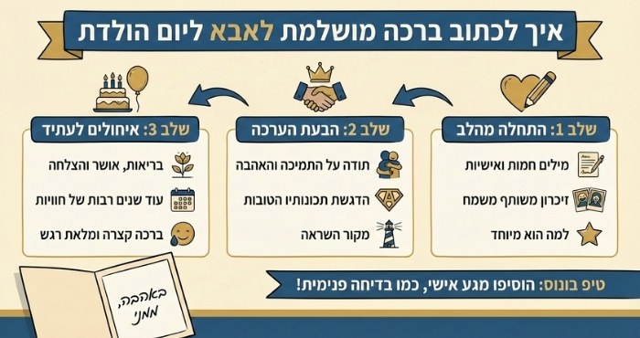 לבסוף, זכרו שברכה מנצחת היא כזו שמרגישה כמו שיחה אישית; כתבו בגובה העיניים, השתמשו בשפה שמרגישה לכם טבעית, והכי חשוב – תנו לו להרגיש שהוא לא רק "עמוד התווך" של הבית, אלא אדם אהוב, מוערך ומשמעותי בזכות מי שהוא.